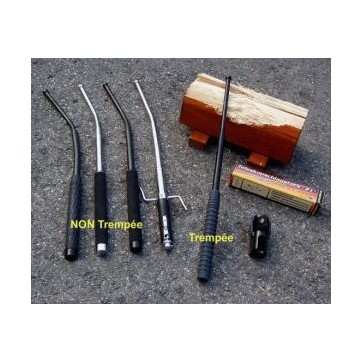 La version trempée diffère de la version ordinaire par la meilleure qualité de ses tubes télescopiques, qui sont de plus trempées. On propose deux types des poignées en caoutchouc de grande qualité – antidérapant au dessin plus anguleux (cette surface diminue notablement les diverses possibilités d’arrachement du bâton de la main et elle donnera à votre client une sensation d´assurance agréable), ou ergonomique avec une surface lisse et une prise agréable surtout avec des gants, qu´utilisent en général les professionnels de la sécurité. Ils ont donc une très grande résistance contre les déformatios dues aux frappes violentes. Ces bâtons répondent aux exigences des normes allemandes concernant les bâtons télescopiques et ils sont prévus pour utilisation professionnelle par la police et les autres forces armées.